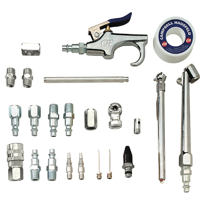 - Kit includes blow gun, 5 blow gun nozzles, 2 tire chucks, 1 tire gauge, 2 inflation needles, 2 female hose connectors, 2 male hose connectors, 4 male plugs, 2 female plugs, 1-1/4-in quick connect, 1 roll of PTFE tape, and 1 case