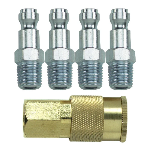 Coupler and plug set. Fits most popular plug styles. The set contains: 1 coupler 1/4 in. NPT female and 4 plugs 1/4 in. NPT male. 1-year limited warranty.