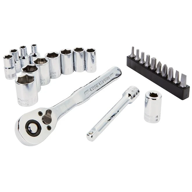 - Includes (11) 1/4-in drive shallow 6 PT sockets metric (4, 5, 6, 7, 8, 9, 10, 11, 12, 13, 14mm), (1) 1/4-in drive ext (3-in), (1) 1/4-in drive bit adapter, (1) 1/4-in drive pear head ratchet and (10) specialty bits