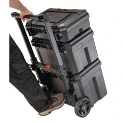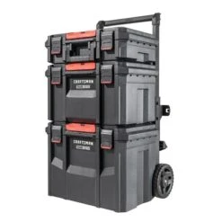 Suitable for any outdoor job or project, the TRADESTACK 22-in Rolling Tower Premium Storage Stack includes a suitcase, deep toolbox, and a rolling unit. The TRADESTACK units connect to each other, automatically stacking via a drop and lock mechanism and easily separating with a one-touch release. They are IP65 dust and water resistant, have a large storage space to fit large and heavy tools, and feature durable 7-in wheels that enable smooth mobility for convenient transport to any destination. Compatible with VERSASTACK modules, and CRAFTSMAN organizers and tool sets via an included adaptor, you will be ready to meet all your stackable storage needs. Made in USA with Global Materials. With its structural foam design for extra strength, it is highly durable.