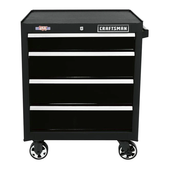 The 2000 Series Craftsman(R) 26-in wide 4-drawer rolling tool cabinet is a rugged storage space that is designed to last, with an 18-20 gauge steel I-Frame(R) double-wall construction. Each drawer can support 75 lb and features heavy-duty soft-close drawer slides that gently pull themselves shut without slamming. This helps keep your tools in place and ensures your drawers stay closed. Full-grip tubular side handles make it easy to carry around, while the embossed top mat protects the surface and prevents tools from falling off when the cabinet rolls. The 2 locking casters and 2 swivel casters can withstand up to 650-lb. Finally, a keyed internal locking system with an included set of keys safeguards your most valuable tools. Black model.