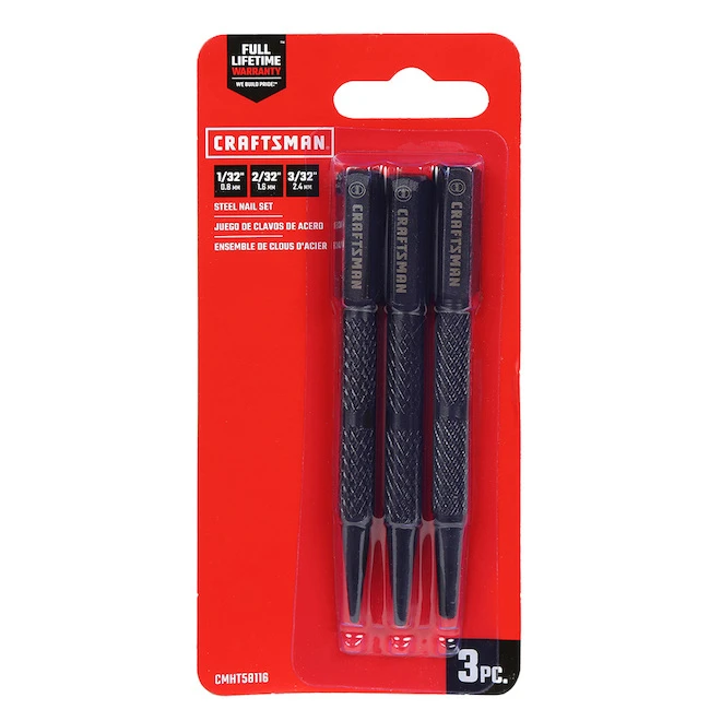 This 3 piece Steel Nail Set has square heads to prevent rolling when set down and also each are fully hardened, precision-milled steel to increase durability. Ideal for setting nails into materials. Long length for setting nails in hard-to-reach areas. Long, beveled tip for easy nail head alignment. Size: 1/32, 2/32, 3/32.