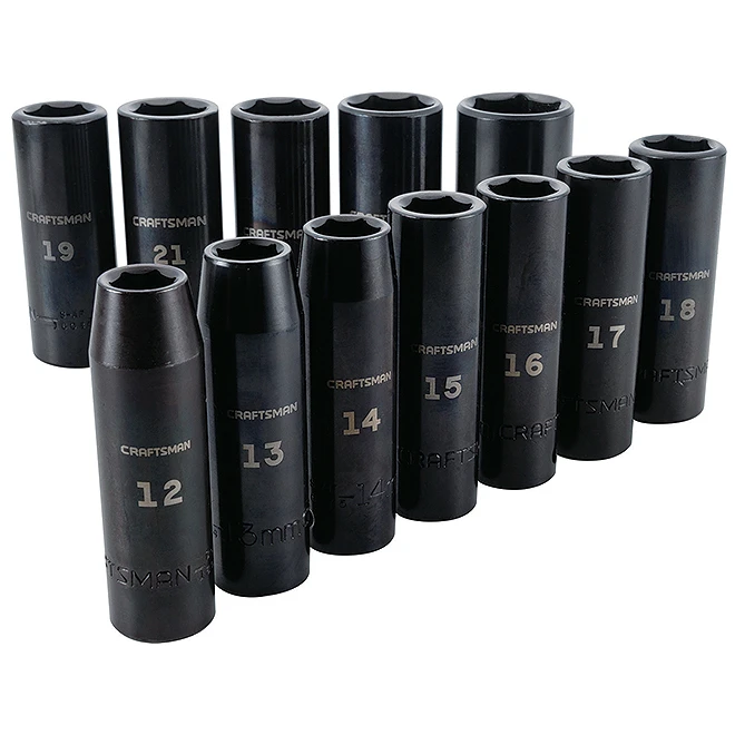 This socket set by Craftsman® features a black oxide finish for corrosion resistance and large markings to help you quickly identify the sockets you are looking for. Also, the 6-point socket design allows for increased torque due to a larger contact surface. Sockets meet or exceed ASME specifications. This set includes 12 deep sockets: 12 mm, 13 mm, 14 mm, 15 mm, 16 mm, 17 mm, 18 mm, 19 mm, 21 mm, 22 mm, 24 mm, and 27 mm. This product is backed by the Craftsman® full lifetime warranty.