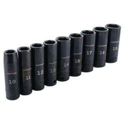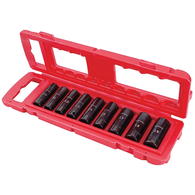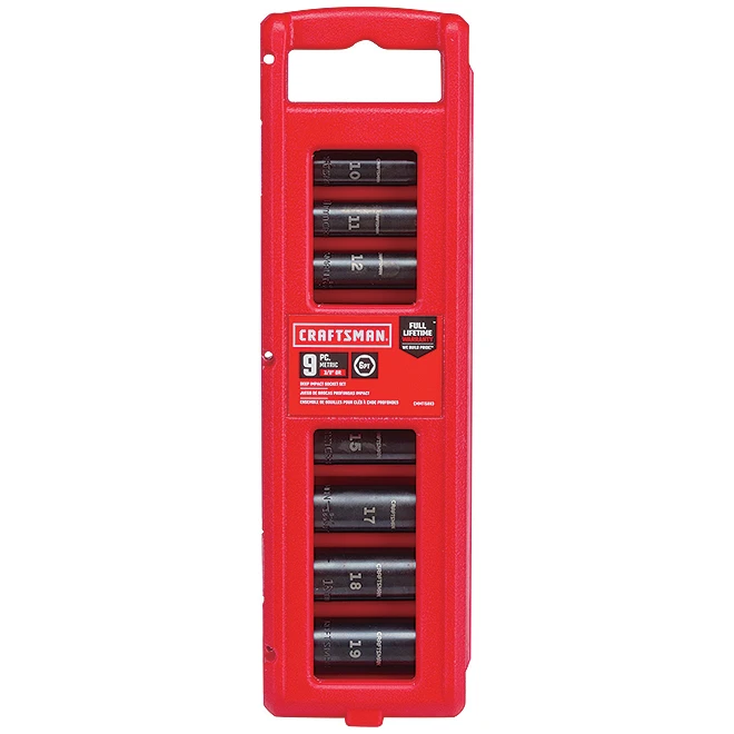- Includes (9) 3/8-in Drive Deep Impact Sockets Metric (10mm, 11mm, 12mm, 13mm, 14mm, 15mm, 17mm, 18mm, 19mm)