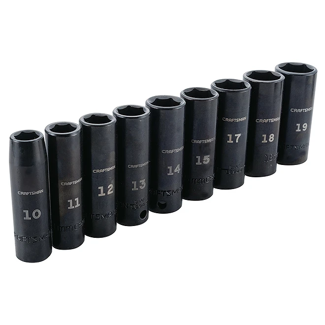 This socket set by Craftsman® features a black oxide finish for corrosion resistance and large markings to help you quickly identify the sockets you are looking for. Also, the 6-point socket design allows for increased torque due to a larger contact surface. Sockets meet or exceed ASME specifications. This set includes 9 deep sockets: 10 mm, 11 mm, 12 mm, 13 mm, 14 mm, 15 mm, 17 mm, 18 mm, and 19 mm. This product is backed by the Craftsman® full lifetime warranty.