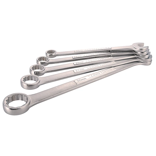 This wrench set by Craftsman® includes 5 jumbo wrenches made of durable steel with a chrome-plated finish that provides resistance to corrosion. The 12-point box end offers quick engagement and the 15-degree box end offset provides for extra working space. The set meets the ASME certifications and includes 5 metric wrenches of 23 mm, 24 mm, 25 mm, 27 mm, and 30 mm. This product is backed by a lifetime warranty.