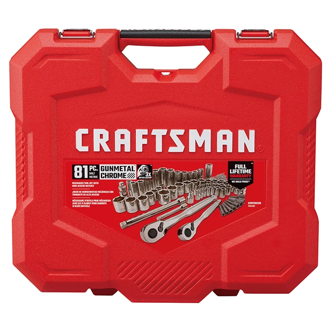 This Craftsman mechanics tool set offers a variety of tools and accessories that will help you accomplish all your projects. With 2 ratchet wrenches (3/8 inch and 1/2 inch), 2 extensions, as well as a wide range of sockets, bits, hexagonal keys and adapters, you will get your money’s worth! Includes a blow moulded plastic case. Backed by a lifetime warranty.