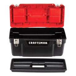 This Craftsman(R) tool box is made of sturdy red and black-coloured plastic. With a width of 16″, it has integrated organizers on its lid that allows for the storage of small parts that you wish to access without opening the box. A removable tote tray lets you store smaller tools that you use more often on top of the rest of your tools. An integrated padlock eye allows you to secure your tools and accessories (padlock not included). This product is backed by a 1-year limited warranty against any defects in material or workmanship.