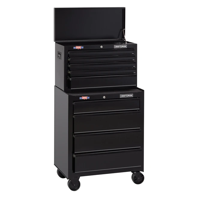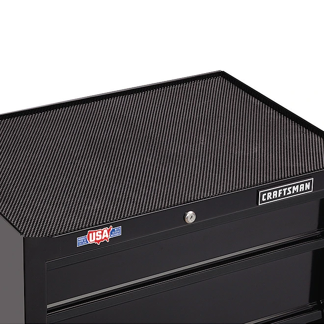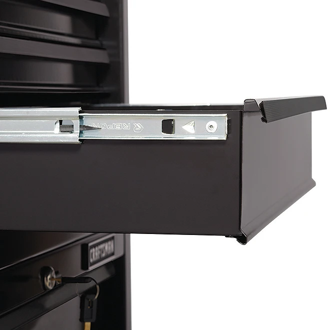 This Craftsman(R) tool cabinet offers an ideal storage solution for tools and supplies with its innovative design and great price. With a width of 26″, it features four drawers to offer spaces of different sizes to store hand tools, power tools, parts and everything in between. Made of black-coloured metal, this tool chest can support a total of 500 lb. It has a ball-bearing drawer slide system, heavy-duty casters and an external keyed locking system. You get quick and easy access to the tools that you use most frequently, and with a simple turn of a key, you will not have to worry about your gear. Backed by a 3-year limited warranty, this product can be topped by the CMST22654BK (41536890) chest, sold separately, in order to create a nine-drawer tool center with lid, therefore offering an excellent storage solution.