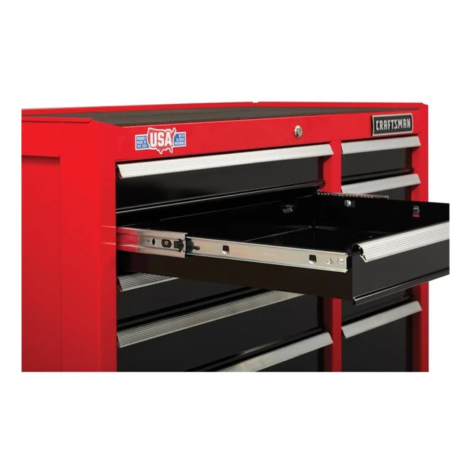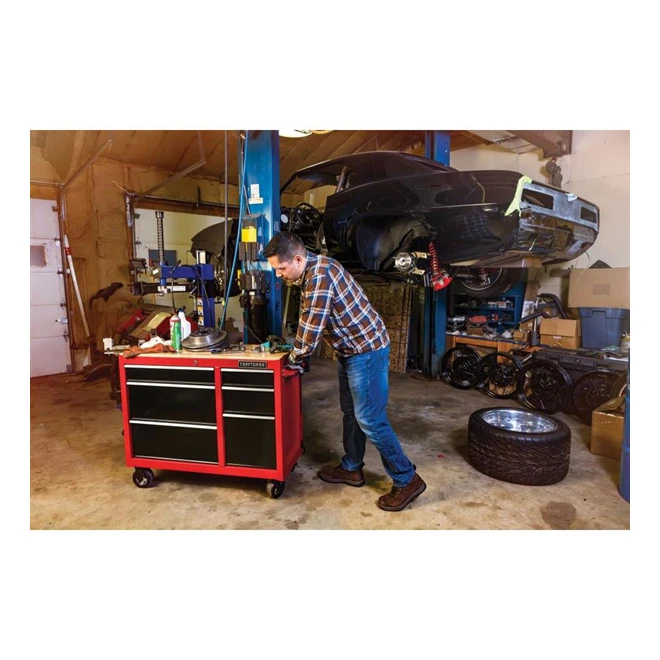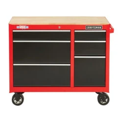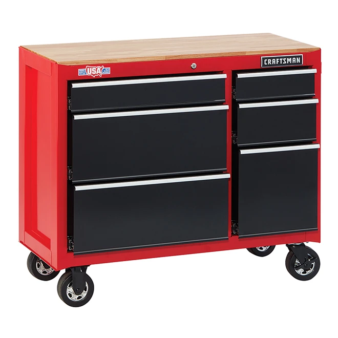 This Craftsman(R) workbench combines versatility and storage capacity. Made of durable steel with a red and black coating, it features six drawers with smooth-closing ball bearing slides, offering all the necessary storage. In addition, some of the drawers are wider, others are deeper, which guarantees you will find the perfect place for all your tools. This cabinet is also equipped with heavy duty wheels, including two locking casters, to offer all the stability you need for your projects, as well as a work surface made of hardwood. With its width of 41″, its height of 34″, and its depth of 18″, this work bench and tool cabinet is the perfect storage unit for any work space. Backed by a 10-year limited warranty.