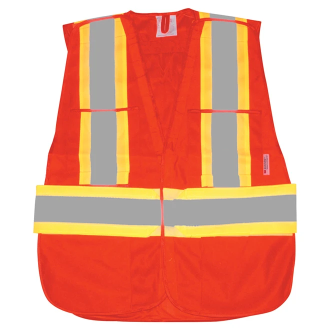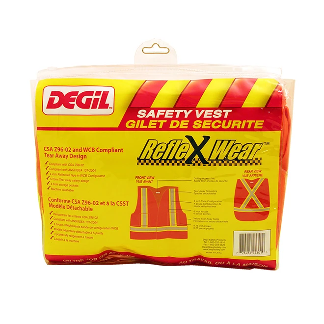 This RefleXWear safety vest by Degil is CSA compliant. It is fluorescent orange, has five 4-inch reflective stripes and 4 front pockets for storage. It is machine washable.