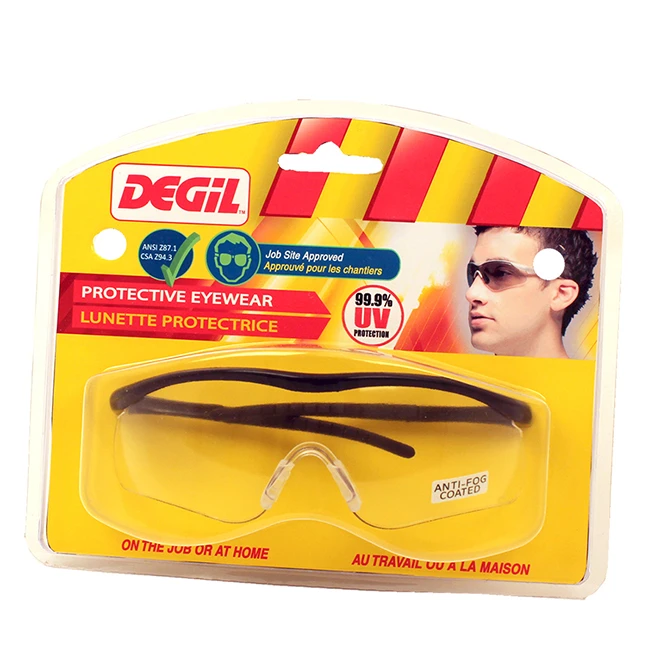 These clear lenses safety glasses are made of polycarbonate. Frame is black and made of nylon. Anti-fog clear, wide-vision and impact resistant. Provides 99.9% UV Protection. Comes with a scratch-resistant coating.