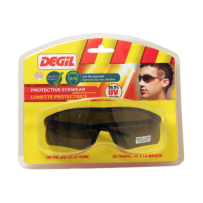 These grey lenses safety glasses are made of polycarbonate. Frame is black and made of nylon. Anti-fog grey, wide-vision and impact resistant. Provides 99.9% UV Protection. Comes with a scratch-resistant coating.