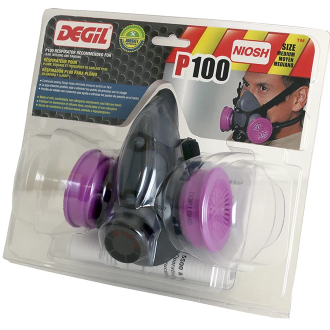 This Degil Safety respirator is designed for working with lead, welding, and sanding. Made with elastomer and silicone, the respirator is soft and non-allergenic. The medium-size mask is sold with 2 P100 filters.
