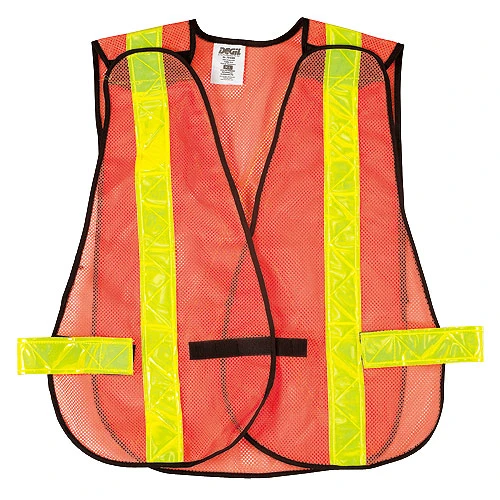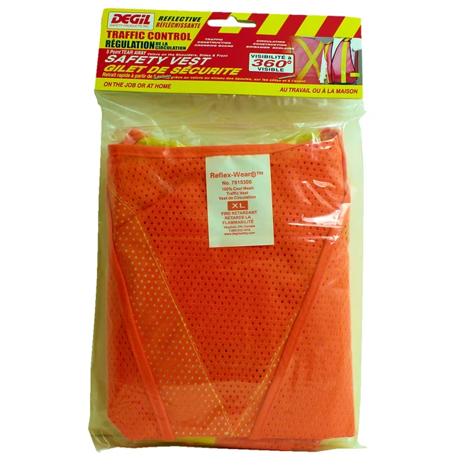 Tear-away shoulders, sides and front, orange mesh with touch fastener closure. 2 inch bright yellow reflective vertical stripes on the front, and “X” style back stripes. Meets British Columbia, Ontario, and all other provinces specifications.