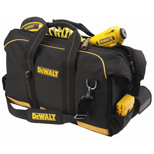 Professional contractor’s gear bag from DeWalt® has an extra-large interior compartment, 4 individual pockets, 1 zippered pocket to secure valuables and 4 exterior pockets. Heavy-duty poly and ballistic poly fabric construction includes base pads to protect bottom. Adjustable, non-slip padded shoulder strap and large padded handles make carrying more comfortable, plus convenience handles on each end for quick easy and comfortable carrying. This product is backed by a 1-year warranty.