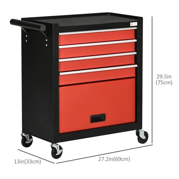 If you need a tool chest to store your tools and keep your workshop clean, this DURHAND toolbox is an excellent choice. 4 drawers and a bottom cabinet provide ample space for your tools and accessories. Inside drawers are EVA mats to protect your tools from damage. Besides, the side handle and four wheels (2 with brakes) allow smooth and easy movement. This tool cabinet will be a must-have piece for your garage or workshop.