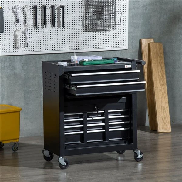 - A large top surface, 6 drawers and 1 large cabinet to keep your tools