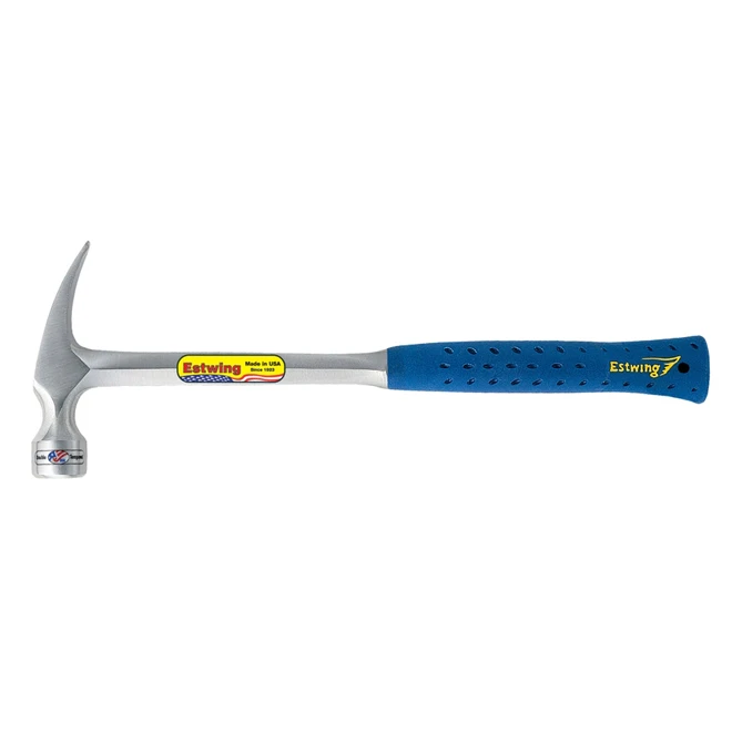 Framing hammer. Weight: 28 oz. Straight claw. Fully polished head. Shock reduction grip. Steel, nylon and vinyl handle.