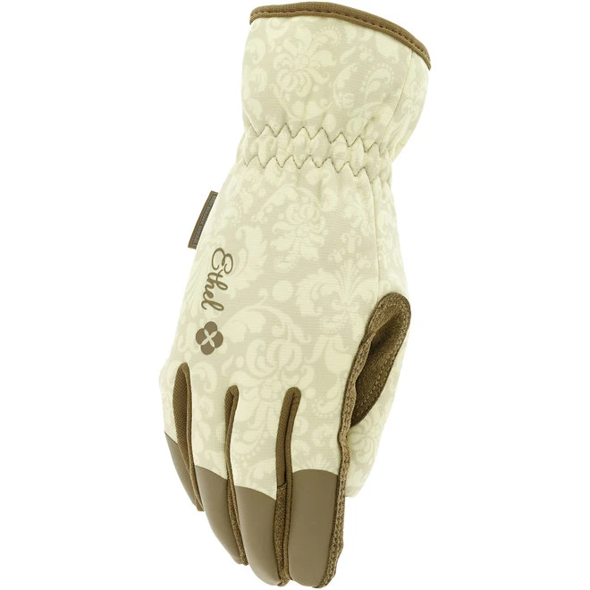 These Ethel garden utility gloves feature touchscreen capable synthetic leather to protect your hands and extended elastic cuffs for a secure fit to your wrist. The form-fitting TrekDry® material helps keep your hands cool and comfortable while you work. These work gloves have double stitching throughout and are machine washable. Rendezvous pattern.