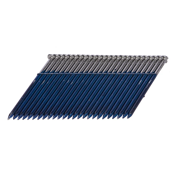 These 2 3/8″ Forestoâ„¢ framing nails are an excellent choice for all your construction projects. They are coated with a thin layer of glue to ensure gripping and feature a smooth shank as well as a “D” head. They are affixed to a metallic wire at a 28° angle. Designed to operate with a pneumatic nailer and used for pallets, framing, sheating, subfloor, decks, and trusses. Sold in a box of 3000 nails. This product is backed by a 30-day limited warranty.