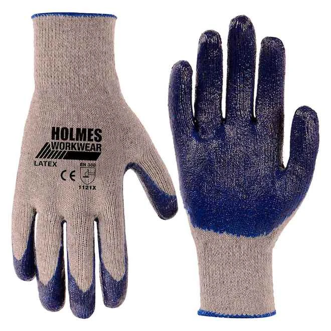 These Holmes gloves are covered with latex on the fingertips and the palms. They are made of 10-gauge polyester and cotton. The cuffs are made of elastic knit.