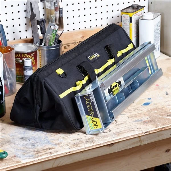 - Large Tool Storage: This PRO Tool Bag features an ultra-wide opening which allows it to fit big tools like the Ladder-Aide Pro or Ladder-Aide SLM extension ladder levellers and stabilizers