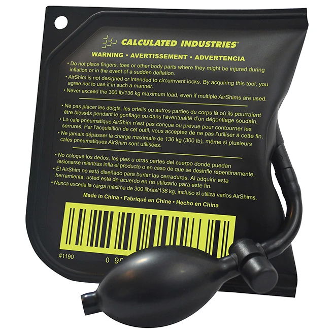Save time and labour, by using the Air Shim (TM) brand inflatable pry bar and air level. It is used for window, door and cabinet installations and replaces lever bars and wooden wedges, making it possible to safely manage standard size installations with a single installer. Certified SGS, it has a nominal load of 300 lbs (136 kg). The rounded corners and the FirmFLex internal reinforcement penetrate into tight spaces of 3/32″ and do not bend under pressure.This product is covered by a 1 year warranty.