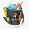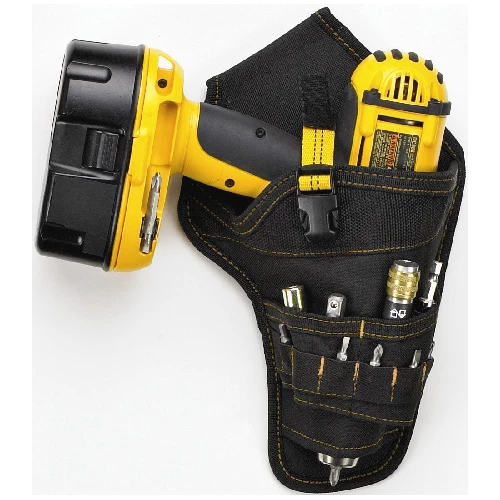 Cordless drill holder. Double layer of rugged lightweight fabric. Holds most of the T-handle drills. Multiple outer pockets for complete bit organization. Safety strap with quick release buckle.