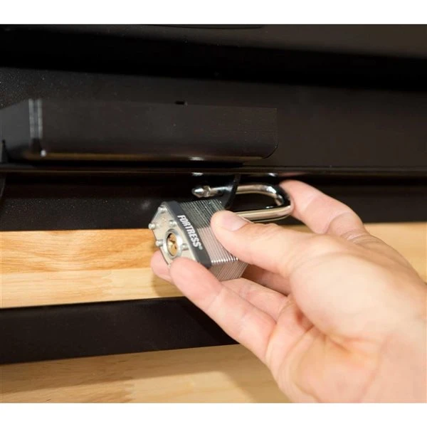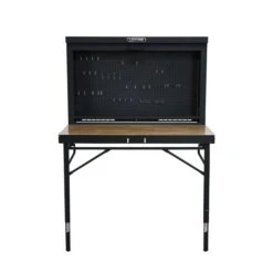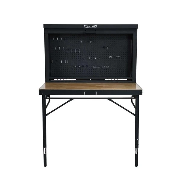 The wall-mounted work table from Lifetime Products is the perfect work and storage solution for your garage or shop area. This unique folding table is constructed of water-resistant wood with a heavy-duty metal frame. The sturdy steel frame has a powder-coated finish that protects against weather, rust, and corrosion and the wood table surface is made of water-resistant durable wood. Included in the design are interior and exterior pegboards to add hooks for tool storage, and the exterior loop will fit any standard padlock, keeping your tools safe and secure. Included are 30 organization hooks to keep your equipment and space in order. The table also has a convenient fold-up design to make storage simple.