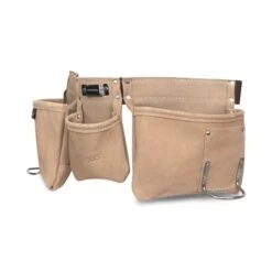 This carpenter apron is made from durable split leather and comes with 5 various sized pockets. It has reversed and rounded corner pockets for easy access and comes with a 2-in wide polyweb belt with a quick-release buckle and 2 rust-resistant nickel-plated hammer holders and rust-resistant capped rivets. Metal measuring tape holder adds an advantage to this carpenter apron. Fits waist from 34-in to 51-in.