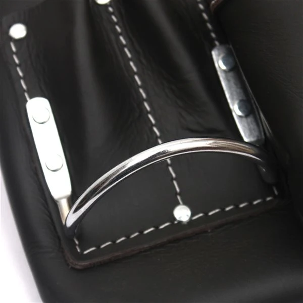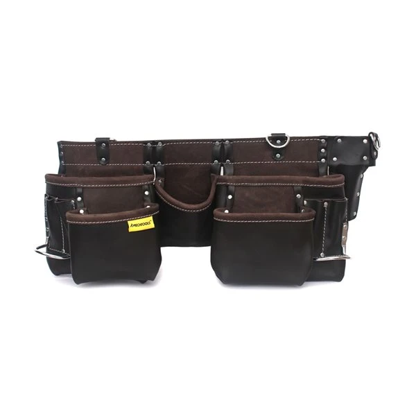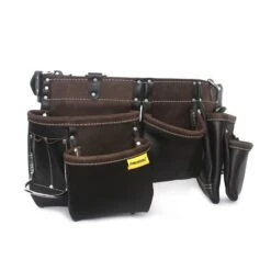 This 11-pocket master carpenter’s apron is made with top grain leather and includes 2 extra large pockets. It comes with rust resistant, extra strong rivets that strengthen stress points and resist leather separation to lengthen apron life. Comes with nickel-plated suspender anchors and hammer and 2 metal hammer rings and a leather belt that fits almost all sizes from 36-in to 51-in.
