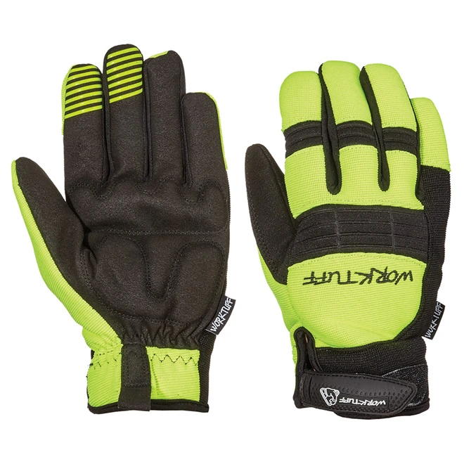 Designed to help you work safely in dim conditions, these Worktuff men’s mechanic gloves feature yellow high visibility material on the backs of the hands and matching Hi-Vis silicone on two fingertips. Tough synthetic leather covering on the palms ensures they stand up to abrasions. They feature padding at the palms and knuckles to guard against vibrations and impacts, while the unlined design helps to maximize dexterity. Self-gripping adjustment strips at the wrists hold the gloves securely in place.