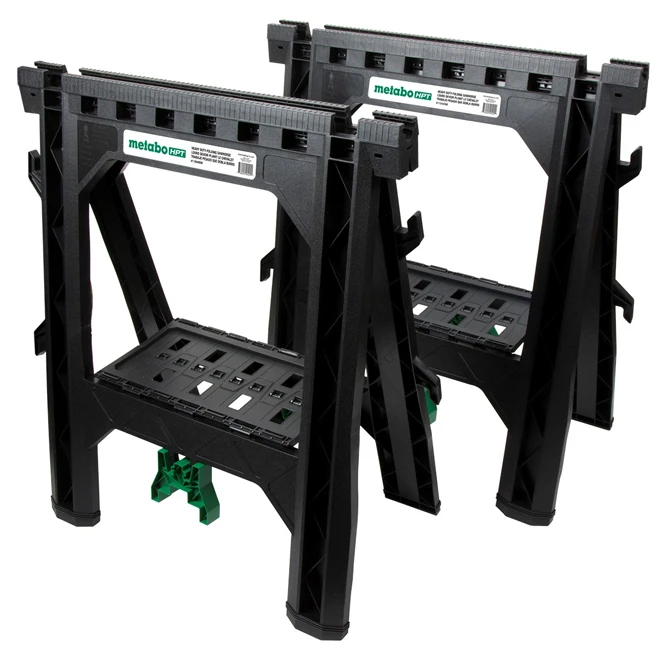 Metabo HPT heavy duty sawhorses feature a 1,200 lb capacity per pair while remaining light weight and easy to move around the job site when folded. Designed to support the flat side of a 2×4, they can be used to raise or extend the work surface area to support 4×8 sheets. A built in shelf and cord hooks provide additional storage for users. This product is covered by a 30-day warranty.