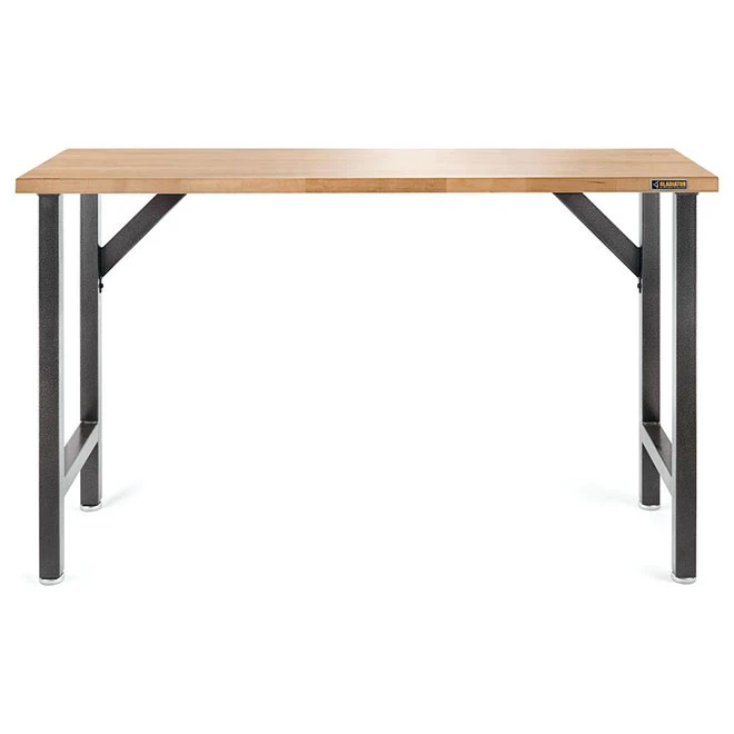This modular workbench from Gladiator will help you keep your workshop or garage well organized. Indeed, it is compatible with other Gladiator products and allows to store up to 2 rolling cabinets underneath the hardwood work surface. Its legs feature nylon pads to prevent scratches on your floor. The wooden surface is UV coated to protect it from common garage chemicals. The sturdy workbench is backed by a lifetime limited warranty on the legs and steel frame, and a 1-year limited warranty on the workbench top.