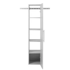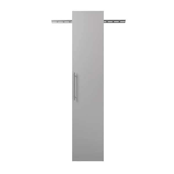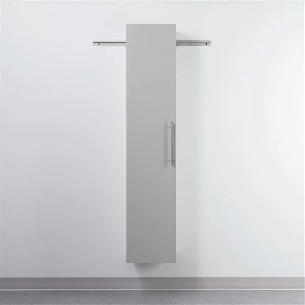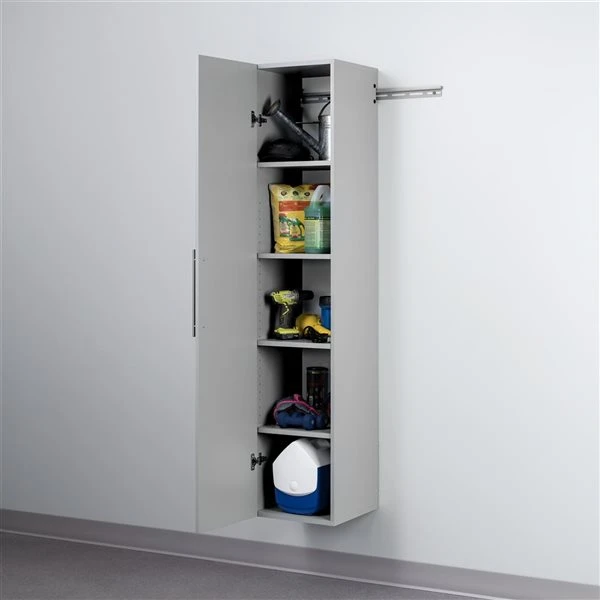 The Prepac HangUps 15 inches narrow storage cabinet offers versatility for your ever-changing storage needs in the garage, laundry room, office or workshop. This cabinet mounts securely to the wall with a heavy-duty metal rail and hook system. The wall mounted feature ensures easy cleaning beneath the cabinets and protects your stored items from water and dirt. The HangUps Collection is constructed using laminated composite wood and features metal handles and adjustable hinges. This product ships ready-to-assemble and includes all hanging rails and fastening bolts.