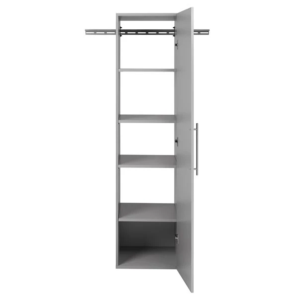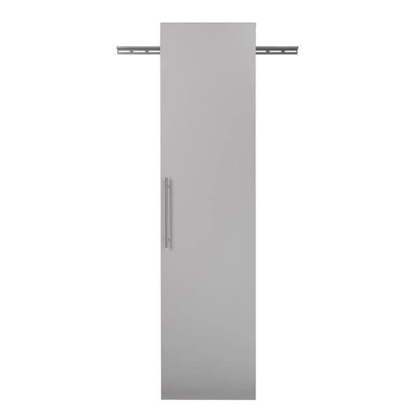 The Prepac HangUps 18 inches narrow storage cabinet offers versatility for your ever-changing storage needs in the garage, laundry room, office or workshop. This cabinet mounts securely to the wall with a heavy-duty metal rail and hook system. The wall mounted feature ensures easy cleaning beneath the cabinets and protects your stored items from water and dirt. The HangUps collection is constructed using laminated composite wood and features metal handles and adjustable hinges. This product ships ready-to-assemble and includes all hanging rails and fastening bolts.