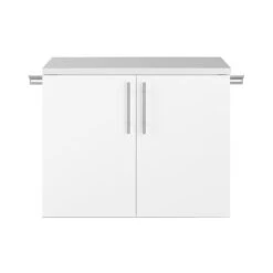 The Prepac HangUps 2-Door Base Storage Cabinet offers versatility for your ever-changing storage needs in the garage, laundry room, office or workshop. This cabinet is constructed using laminated composite wood and features 2 doors and 2 adjustable shelves. The Base Cabinet mounts securely to the wall with a heavy-duty metal rail and hook system. The wall mounted feature ensures easy cleaning beneath the cabinets and protects your stored items from water and dirt. This product ships ready-to-assemble and includes all hanging rails and fastening bolts. Add other cabinets from our HangUps Collection to create a storage system to convert any cluttered room into an organized space.
