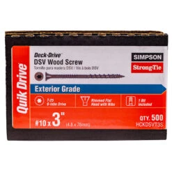 Ribbed-head design countersinks easily and provides a clean, finished appearance. High-low tip provides fast starts. Optimized threads for dimensional lumber. Quik Guard coating provides corrosion resistance for exterior and certain preservative-treated wood applications. Meets the performance requirements of AC257 exposure conditions 1 and 3. T25 6-lobe drive. Dimensions: #10 x 3-in