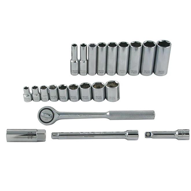 Ideal for all types of mechanic work, designed for both residential and commercial/professional usage. Moulded box containing (9) regular sockets and (9) deep sockets, (1) 8″ round head ratchet with 41 teeth, (1) 5/8″ spark plug socket and (2) regular extensions of 3″ and 6″.