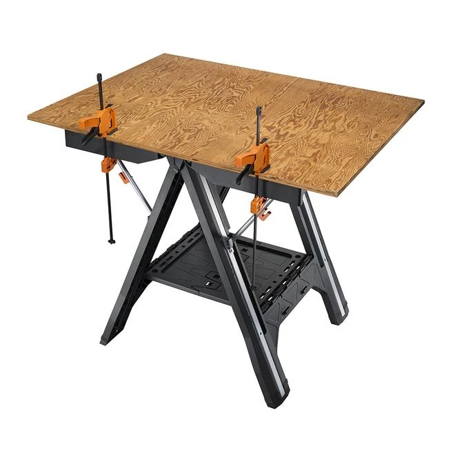 Versatile Worx(TM) Pegasus work table that may be used as a sawhorse and work bench. Equipped with clamping system to secure any material firmly. 2 Universal quick clamps. Compact and lightweight design for quick and easy transporation and storage. Folding tray for tool storage. Table joiner link to lock several tables together. Quick and easy setup. Max clamping wdith: 18″ (45.7 cm). 6-year warranty.