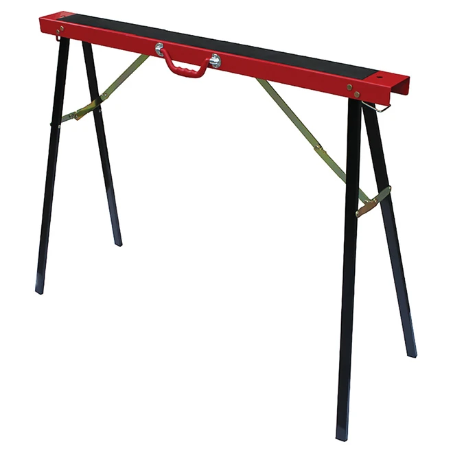 Convinient folding sawhorse made of heavy-duty galvanizes steel with non-slip padded top. Load capacity: 330lbs (150kg). With carrying handle. Folds and unfolds easily to make storage easier.